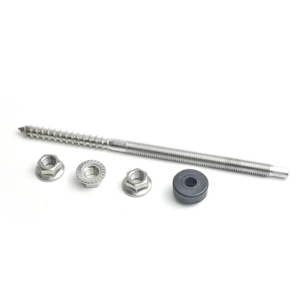 Constructed from SUS304 stainless steel, these bolts are ideal for wooden rafters. Used with L-feet, each set includes three nuts and a waterproof EPDM rubber pad, allowing height adjustment and long-term weather resistance.